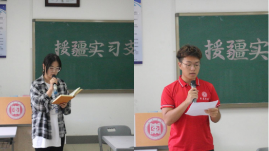 2022援疆归来的模范学生代表姜明妤、王怡然分享了援疆经历与心得体会。本次援疆学生代表田皓元号召同学们发扬我院优良传统并表达了做好援疆支教工作的决心。