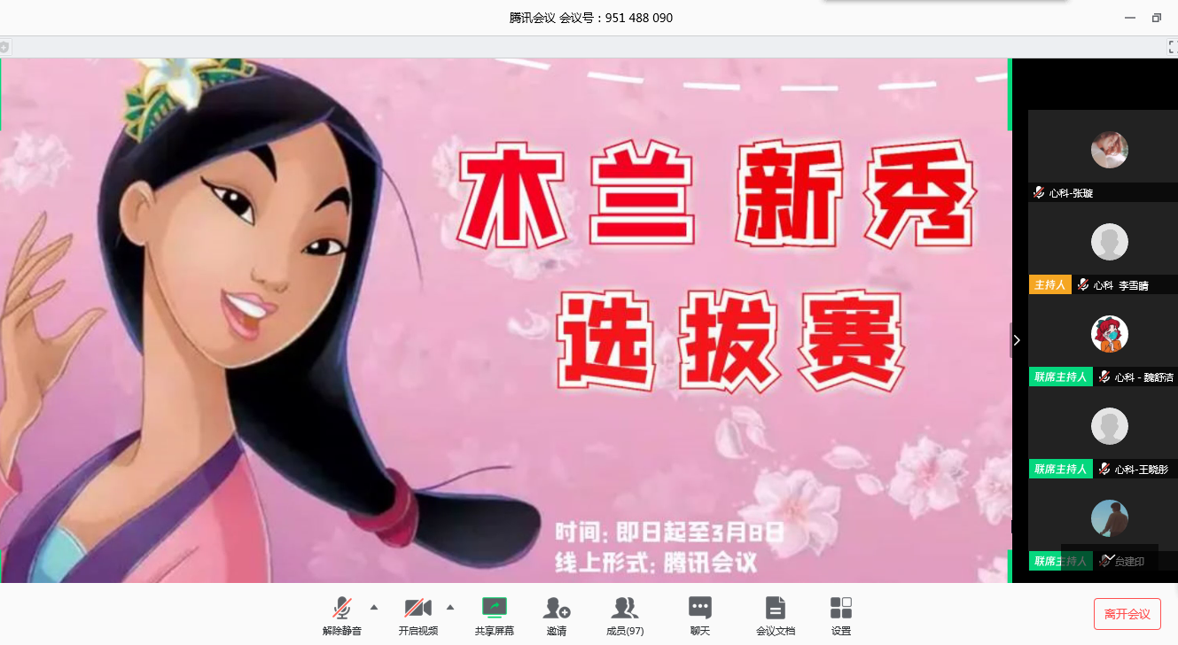 3月7日—8日,木兰新秀选拔赛——“木兰当自强”原创演讲环节和特长展示环节通过腾讯会议平台如期开展。妇委会主任巴岩、学生工作处处长王勤晓、学生工作处副处长李相明,我院党总支书记赵荣军、党总支副书记宋明峰等学校及各二级学院领导老师出席线上活动,来自各学院的19位选手参加比赛,学生工作处副处长张昆等老师及各二级学院学生会主席担任评委。