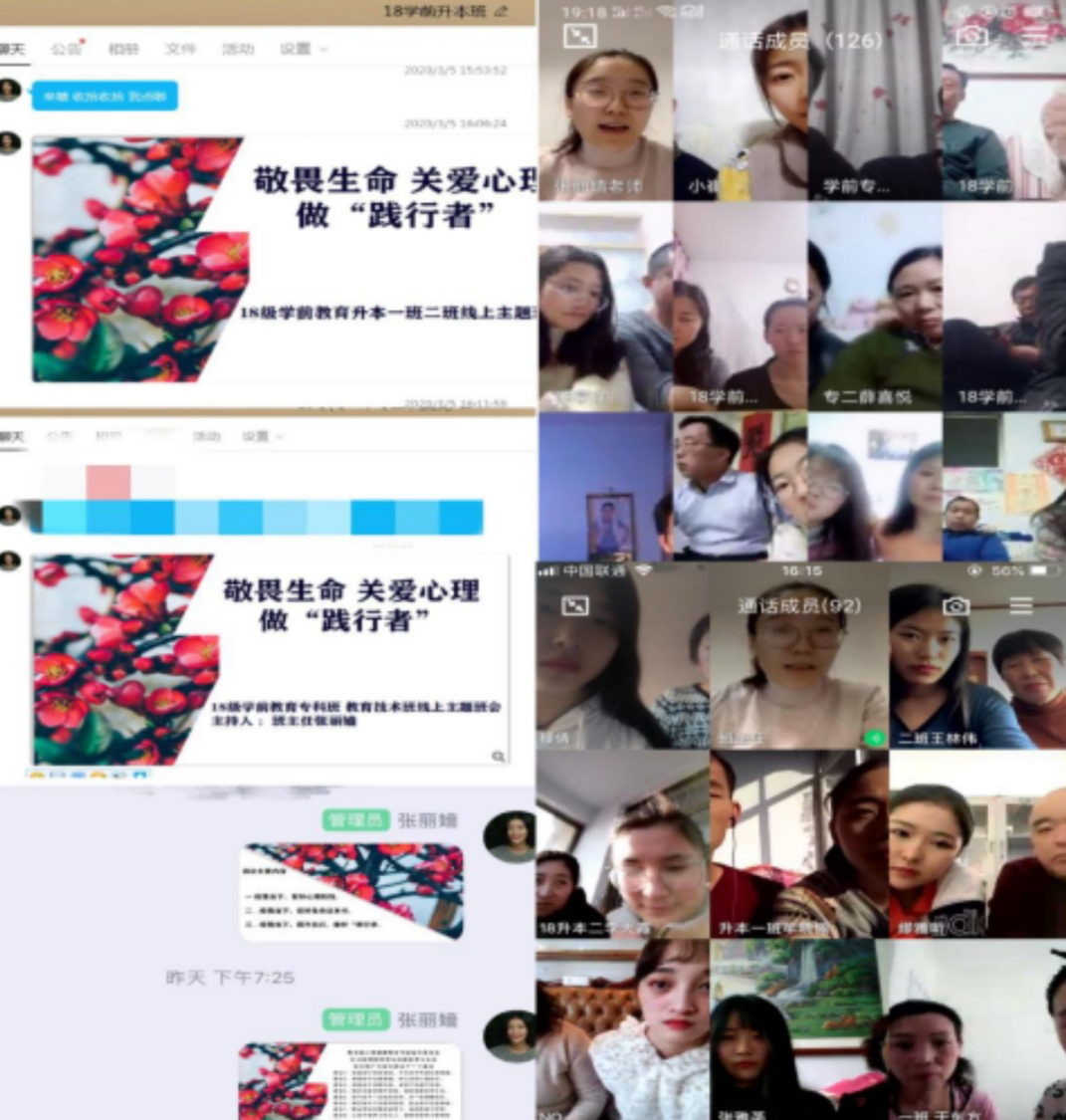 辅导员沟通了解了同学们的居家网课学习情况,提出了切实可行的建议,督促大家做好学习规划,准时上网课,保质保量的完成学校老师布置的任务,好好陪伴自己的家人。并邀请16级专升本同学邱茹、17级专升本学生魏晓涵等分享自身升本的经历以及考研、考编备考过程中的注意事项,给低年级同学们提出了建议。靳昕还为毕业班同学疏解心理压力,叮嘱同学们放平心态。提醒家长和同学按照省教育厅新冠肺炎疫情处置工作领导小组关于组织收看学校开学前疫情防控规范培训特别节目的通知要求,准时认真收看。