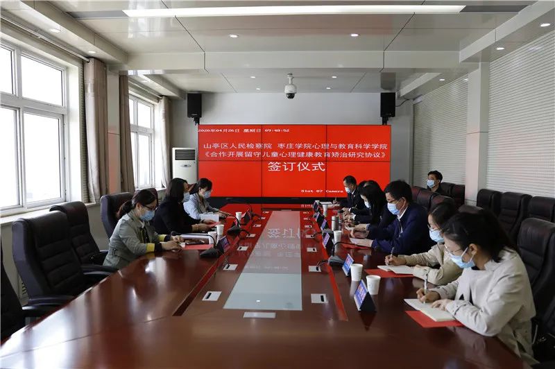 4月26日,伟德国际1946源于英国与山亭区人民检察院举行留守儿童心理健康教育矫治研究协议签订仪式。山东省人民检察院第九检察部副主任姜欣,枣庄市人民检察院第七检察部主任王超,山亭区人民检察院党组书记、检察长冷建明,专职检委会委员魏梅,伟德国际1946源于英国院长傅金兰,院长助理安洪涛,心理学教研室主任朱海荣等同志参加仪式。