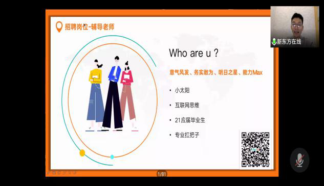 新东方旗下在线教育网站宣讲人介绍了其公司的具体情况,并对公司的工作地点和内容、招聘流程、薪资福利待遇作了详细的介绍。