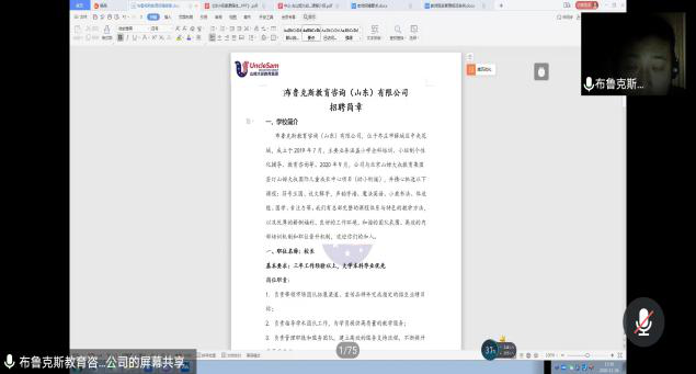 布鲁克斯宣讲人以文件的形式进行宣讲,从地理位置、教学安排、发展待遇三个方面为同学们详细介绍了该机构的工作性质、工作环境、岗位需求、薪资待遇等问题。